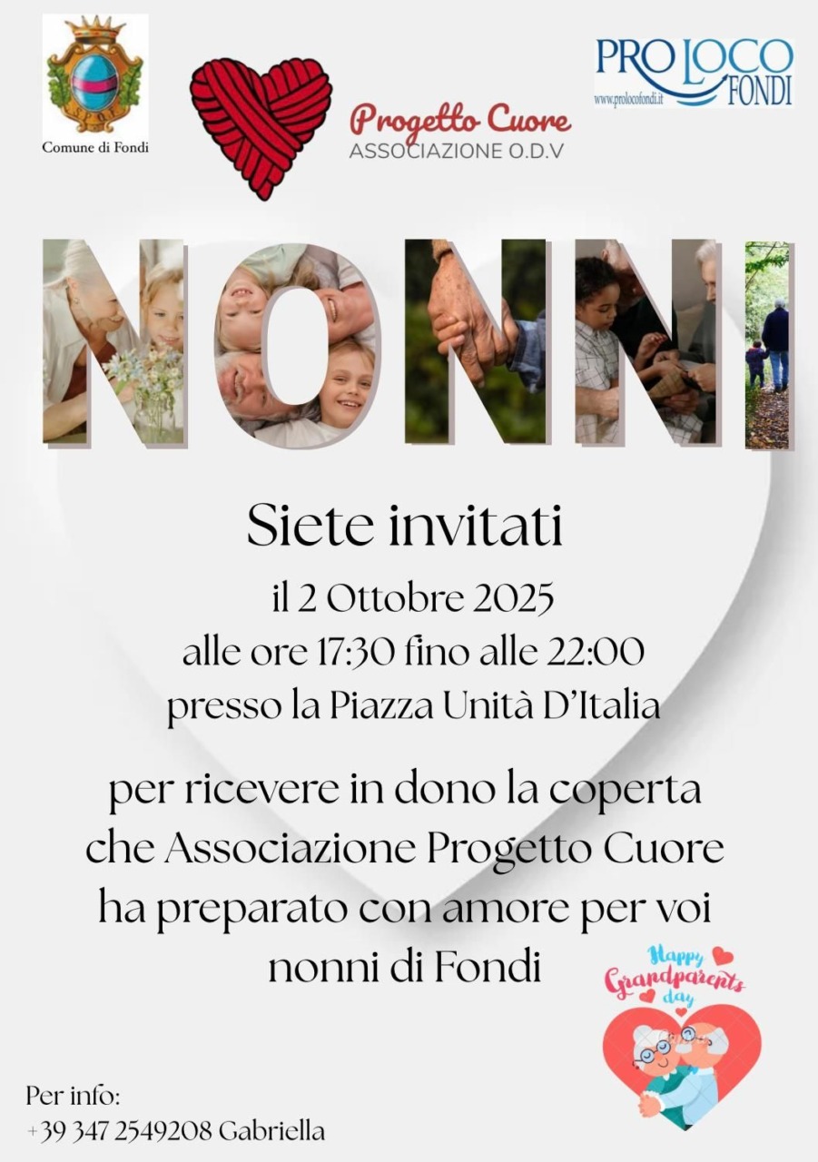 Quel giorno, in Piazza Unità d’Italia dalle 17.30 alle 22, verranno donate le coperte proprio ai nonni di Fondi. Sarà un momento emozionante che vedrà protagonista la terza età. Ma l’impegno dell’Associazione Progetto Cuore a quanto pare non è apprezzato da alcuni, in minima parte per la verità, che hanno criticato la manifestazione del 7 settembre quando le scalinate dell’anfiteatro sono state colorate dalle coperte. Un post anonimo sui social che ha trovato piena condanna da parte di tutti coloro che viceversa apprezzano l’impegno di questa associazione che gratuitamente realizza e consegna le coperte ai bisognosi, spesso andando anche all’Estero, nei Paesi dalle temperature più rigide.