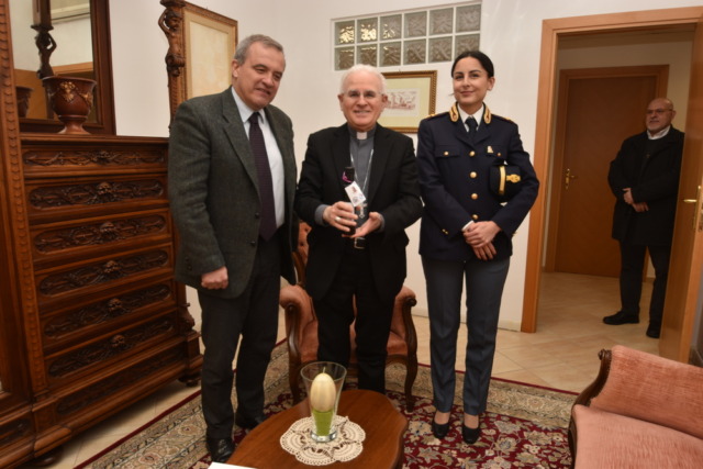 L’incontro ha rappresentato anche un momento di confronto istituzionale e l’occasione per un primo scambio di auguri in vista delle festività pasquali tra il Vescovo e il Questore, accompagnato anche dal Commissario della Polizia di Stato dr.ssa Francesca BRUNI. Nel ricevere il dono, Mons. Crociata ha dichiarato:«Ringrazio la Questura di Latina per il dono dell’olio, che in questo caso raggiunge il livello di grande valore simbolico. La prossimità della Pasqua ci invita ad unirlo all’olio che sarà benedetto nella Messa del Crisma e soprattutto ci riporta il richiamo pasquale alla resurrezione, a risorgere dalla morte del male. Che la nostra vita fiorisca con opere di giustizia e di bene. Grazie».