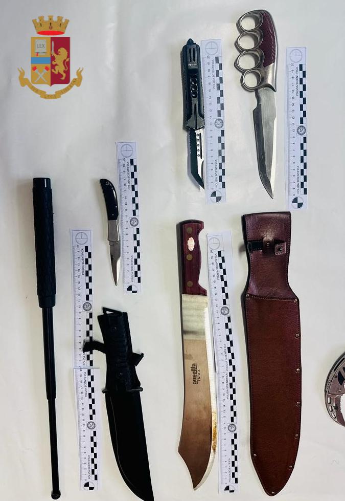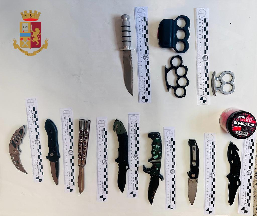 Nella camera da letto dell’uomo, all’interno dei cassetti di un armadio e sotto il letto, sono stati trovati 4 fucili, dei quali uno a canne mozze, 4 pistole, 3 tira pugni, di cui uno dotato di taser elettrico, diverse confezioni per il munizionamento, 13 armi bianche, tra pugnali e coltelli ed un machete.