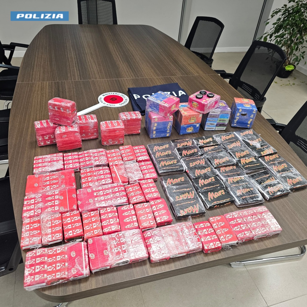 Nel bagagliaio dell’autovettura sono state trovate tre scatole di cartone contenenti ciascuna una borsa tecnica con sostanza stupefacente del tipo hashish, suddivisa in panetti da 100 grammi e contrassegnata con effigi di noti marchi commerciali.