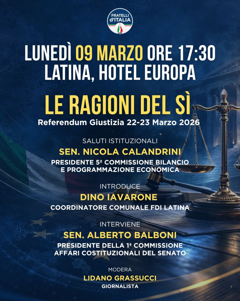 Referendum sulla Giustizia, a Latina l’incontro “Le ragioni del Sì” organizzato da Fratelli d’Italia, si terrà lunedì 9 marzo alle ore 17.30, presso l’Hotel Europa di Latina.